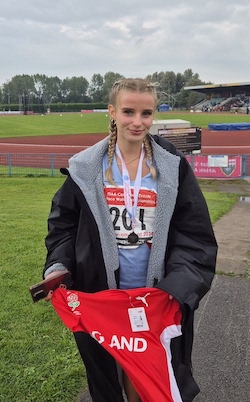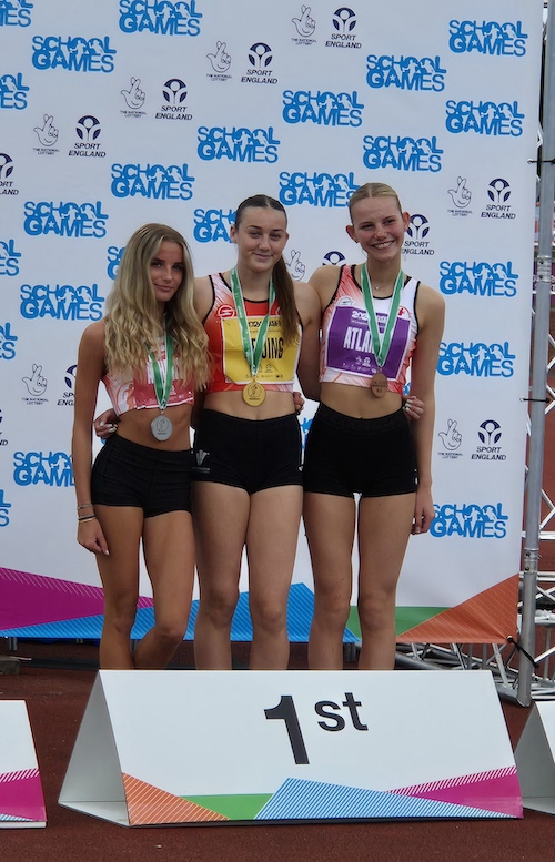 Despite having only a few hours sleep following a middle of the night return from holiday, Thaila-Jade Mason secured the long jump silver medal representing Athens at the UK School Games. The winner, Olivia Schrimshaw (Wales and Beijing), is the UK number one and the only athlete to have beaten Thaila, (UK number two) in competion this year. Thaila’s 5.61m was just sufficient to restrict Gracie Osman (England and Atlanta) to 3rd place.
